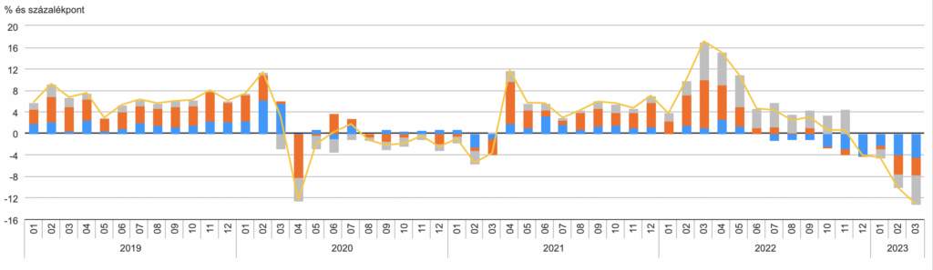 The KSH wrote that in March 2023, with a significant base effect, the volume of retail trade decreased by 12.6% compared to the same period of the previous year. The volume of sales adjusted for the calendar effect was 10.3% lower in food and food-related mixed stores, 9.6% in non-food retail, and 29.3% in fuel retail.